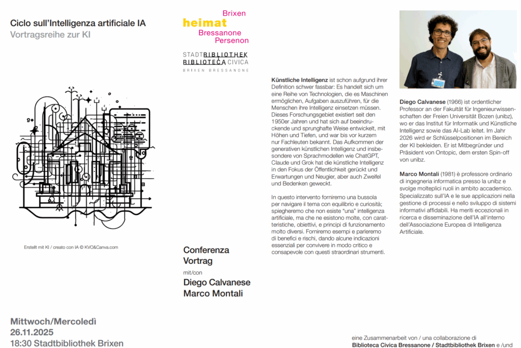 Diego Calvanese (1966) è professore ordinario presso la Facoltà di Scienze e Ingegneria della Libera Università di Bolzano (Unibz), dove dirige l’Istituto di Informatica e Intelligenza Artificiale e il laboratorio AI-Lab. Nel 2026 ricoprirà posizioni chiave nel settore dell’IA. È cofondatore e presidente di Ontopic, il primo spin-off di Unibz.